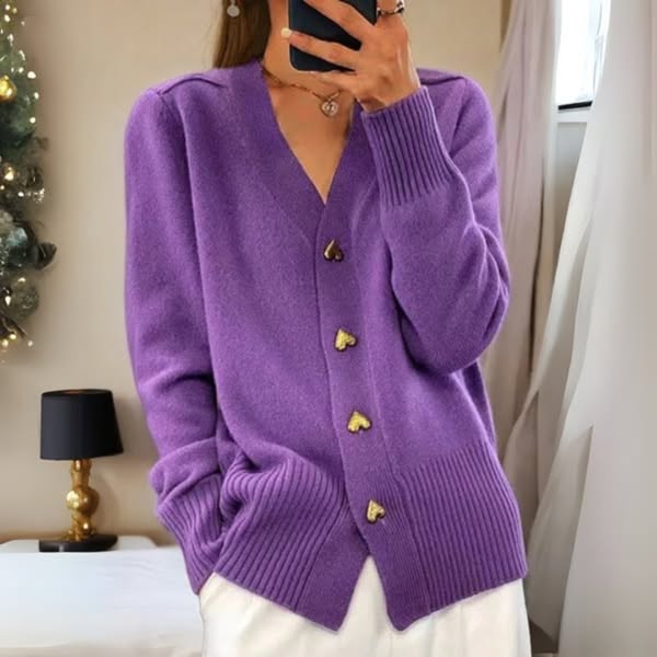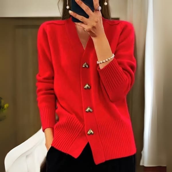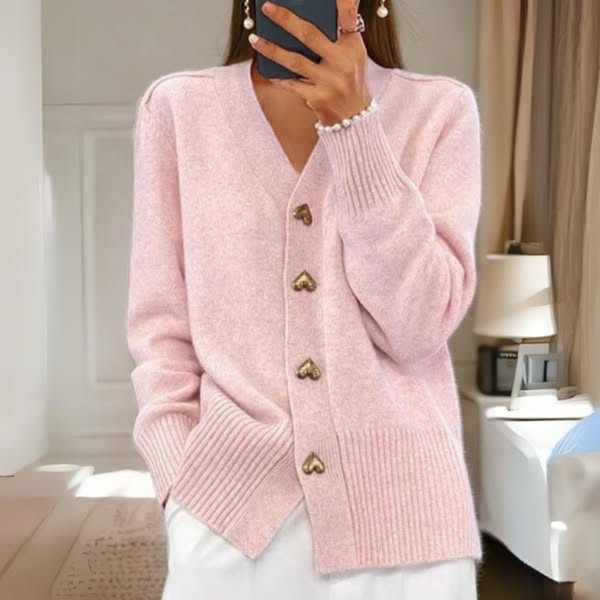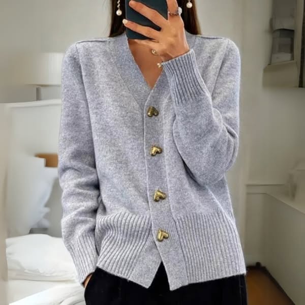 Upplev en perfekt balans mellan komfort och elegans med denna mjuka, stickade kofta. De unika hjärtformade knapparna ger plagget en subtil men exklusiv detalj som lyfter hela looken.
